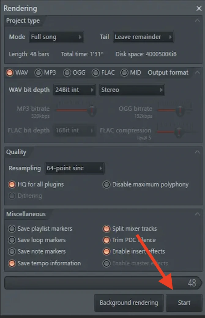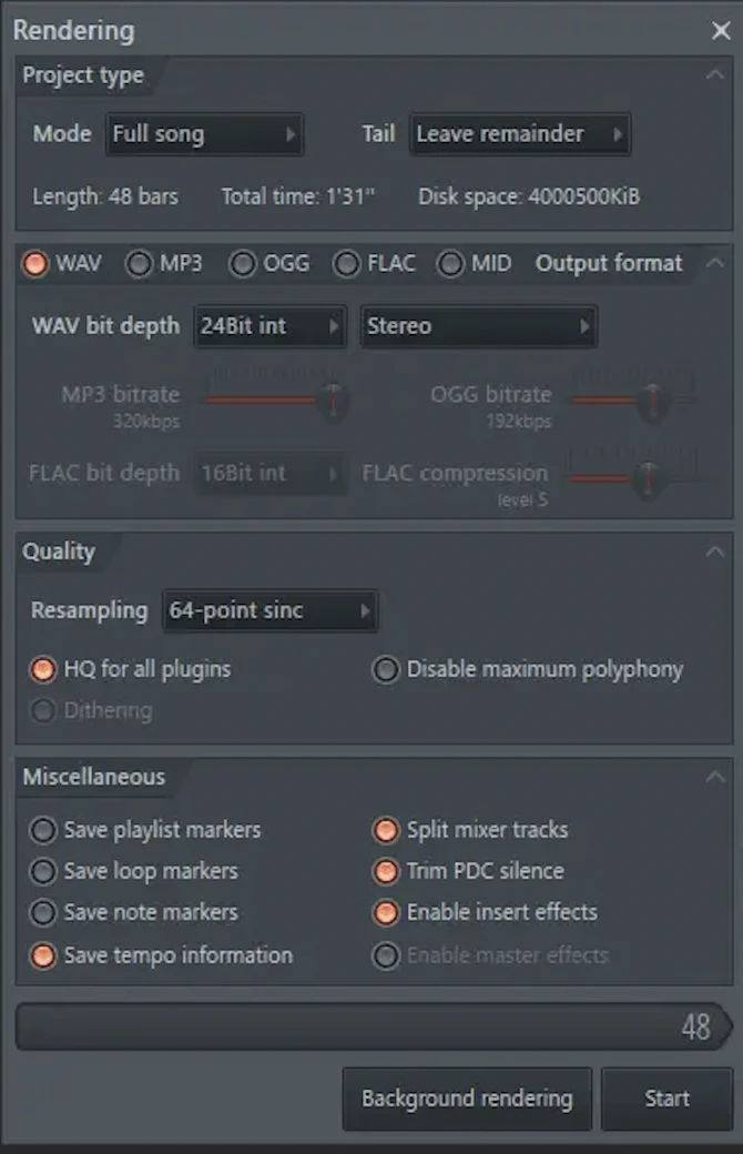 Once you have followed the above steps, FL Studio will ask you for the location where you want to save your stems. Once you select the location, a setting dialogue box will appear. There are several setting options you can choose from which are explained below.